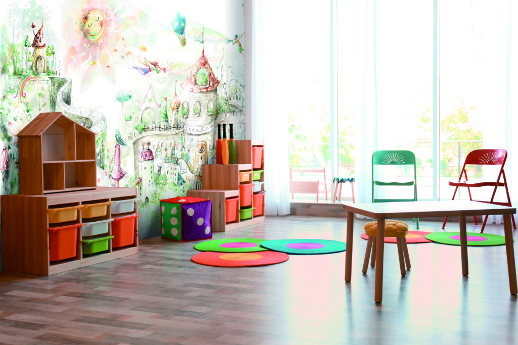 高精細プリントの壁紙としてキッズコーナーの壁面に施工しました